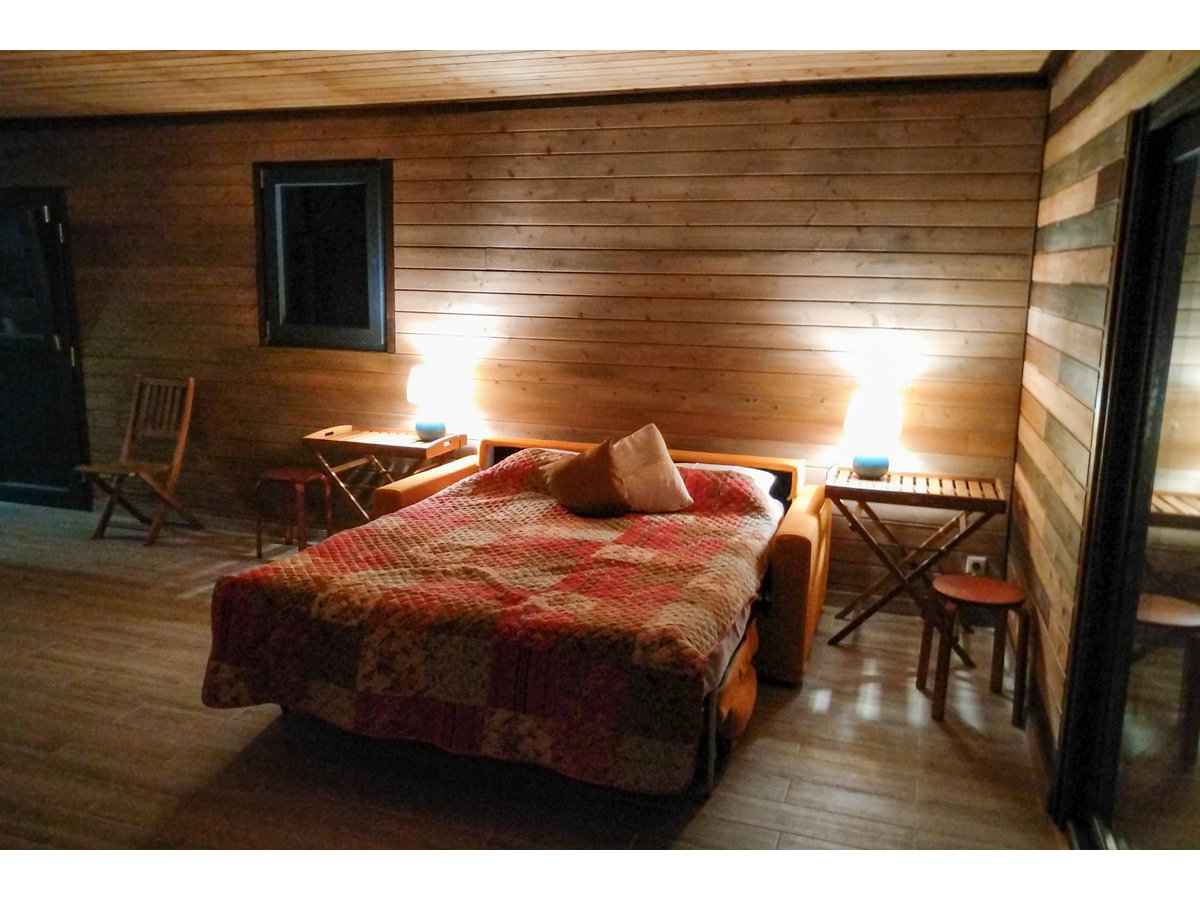 Das Haus ist ein doppelwandiges und zusätzlich isoliertes Holzhaus. Eine Wärmepumpe heizt oder kühlt es. Es ist uneingeschränkt ganzjährig nutzbar.