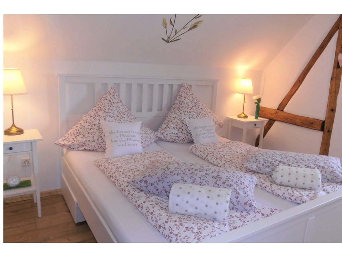Das großzügige Schlafzimmer mit freigelegten Fachwerk hat seinen besonderen Charme.