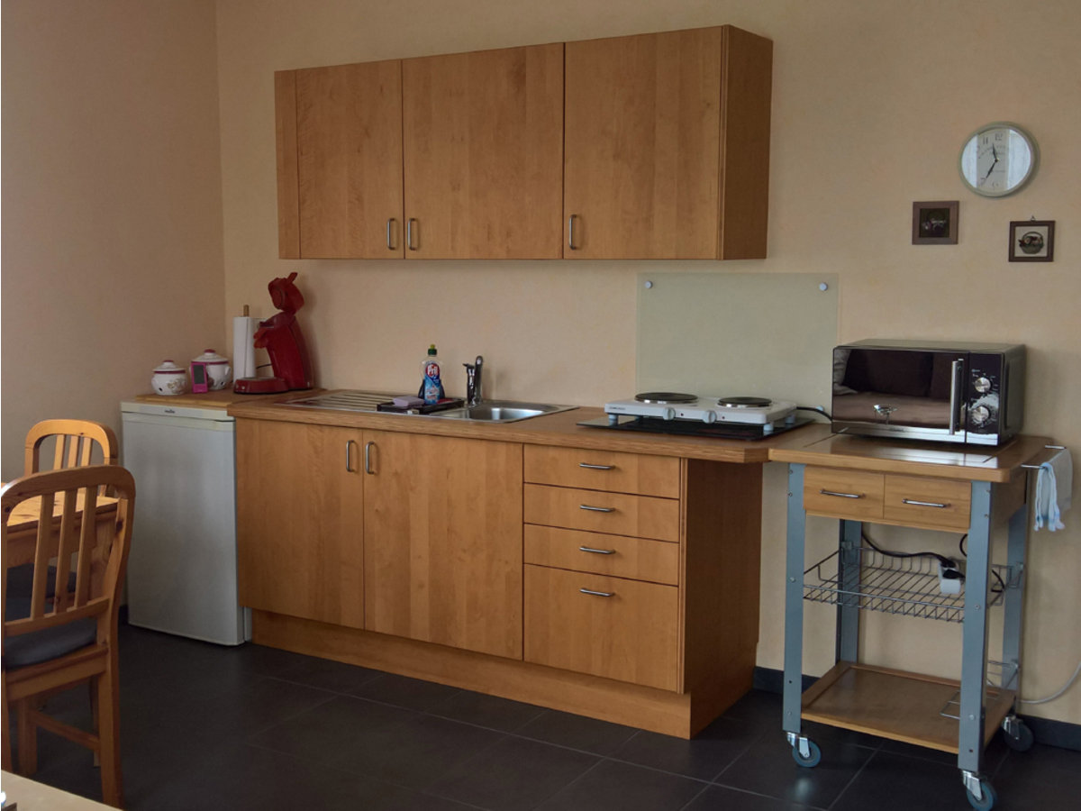 Sie ist ausgestattet für 2 Personen. Schlafzimmer mit 2 Einzelbetten, Kleiderschrank vorhanden. Großer gemütlicher Wohnraum mit Eck-Sofa (Federkern) und kleiner Küche mit Essbereich. Mikrowelle, 2-Platten-Herd, Kühlschrank, Kaffee-Pad-Maschine, Handmixer, Toaster, Geschirr, Bügelbrett, Bügeleisen usw. vorhanden. Das seperate Bad beinhaltet Dusche, Waschbecken und WC. Waschmaschine, TV-Gerät und WLAN verfügbar und im Preis enthalten.