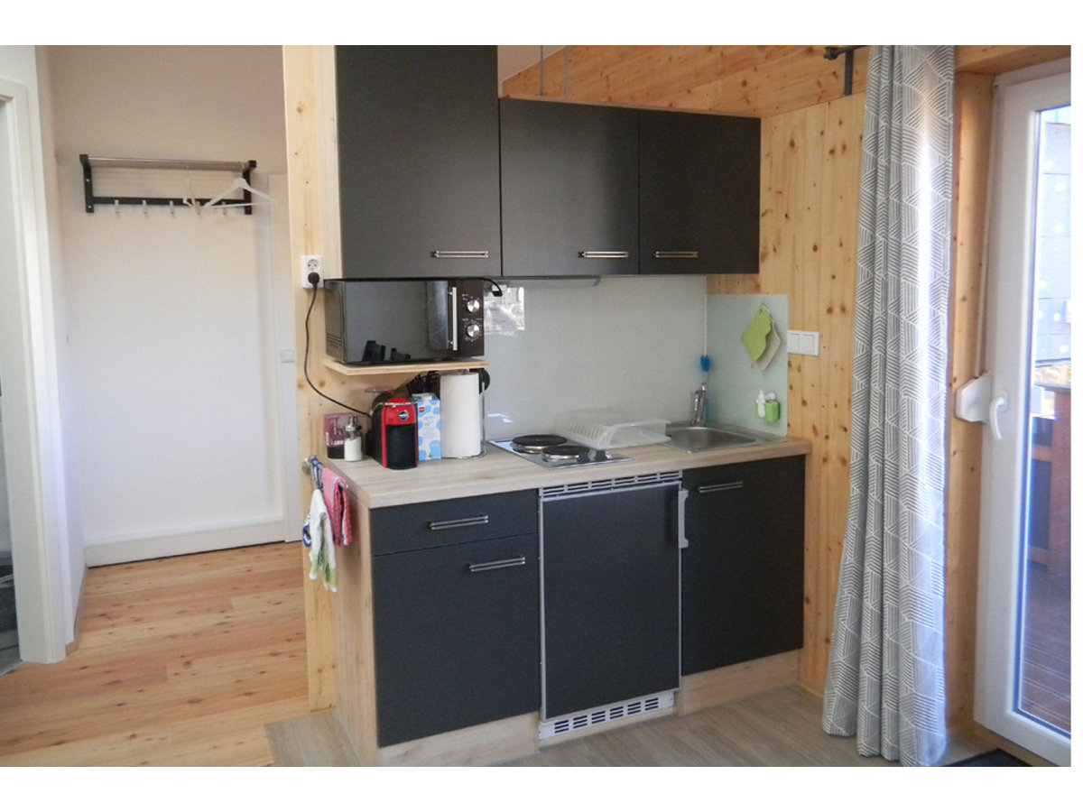Gegenüber befindet sich eine kleine Küche mit Essbereich. Mikrowelle, 2-Platten-Herd, Kühlschrank, Kaffee-Kapsel-Maschine, Handmixer, Toaster, Geschirr, Bügelbrett, Bügeleisen, Fön usw. vorhanden.