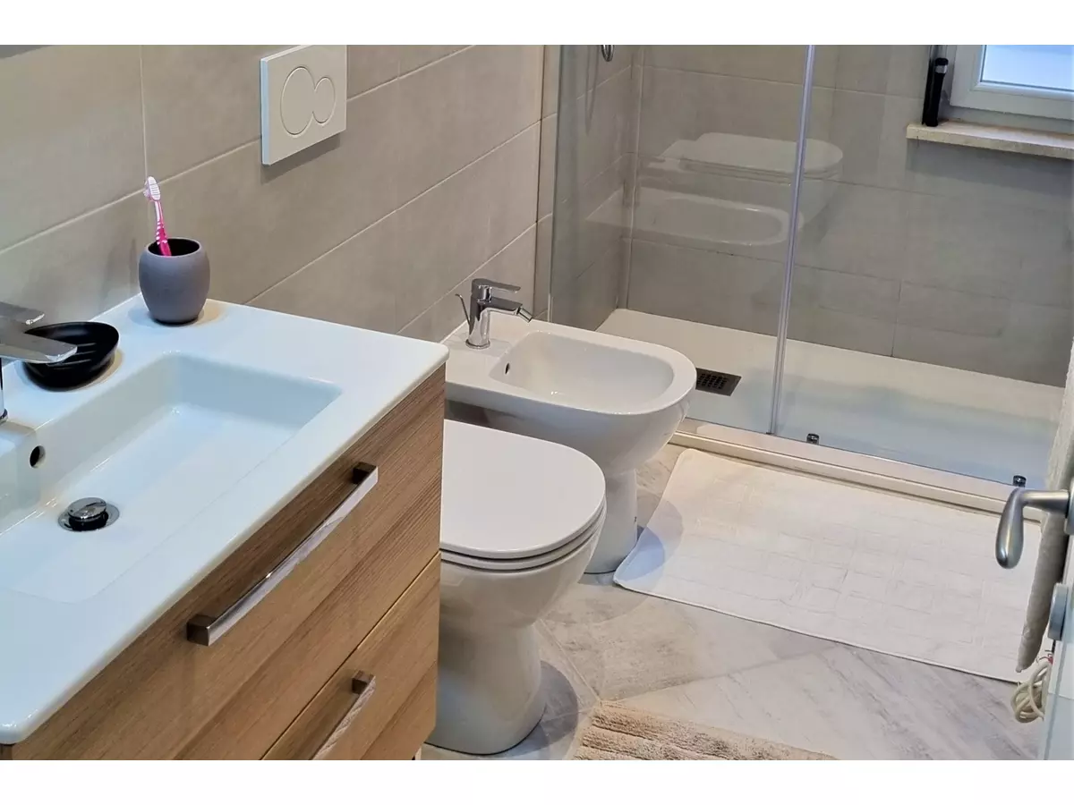 Ein Waschbecken mit zwei Schubladen. Ein Bidet sowie eine geräumige Glasdusche. Für den Winter haben wir eine zusätzliche elektrische Heizung installiert.