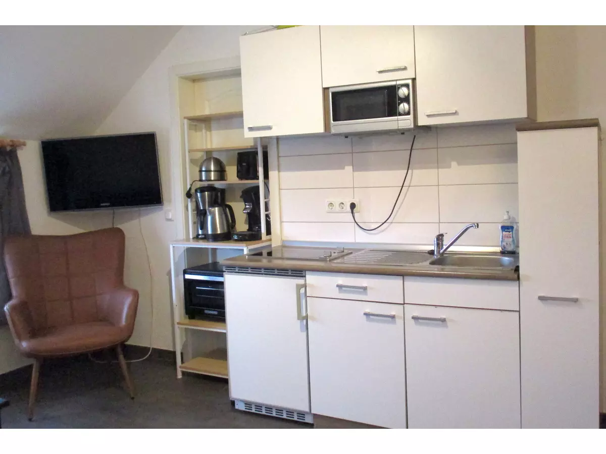 Die Einbauküche ist mit ausreichend Geschirr, Kochutensilien und den notwendigen Elektro-Kleingeräten (Kaffeemaschine, Kaffee-Padautomat, Toaster, Wasserkocher, Eierkocher, Raclette- und Fonduegerät) ausgestattet.