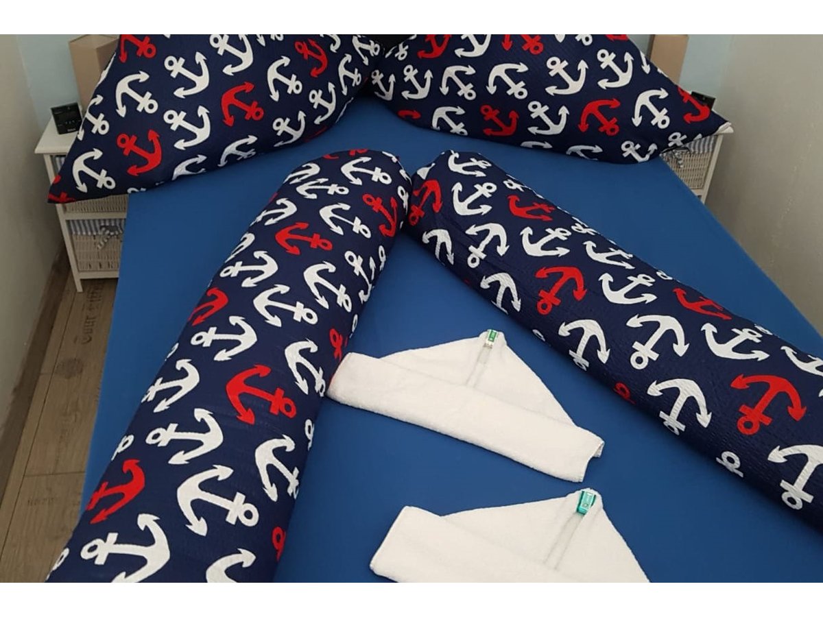 Die Ferienwohnung liegt zentral zu Hafen, Innenstadt und Perlebucht .