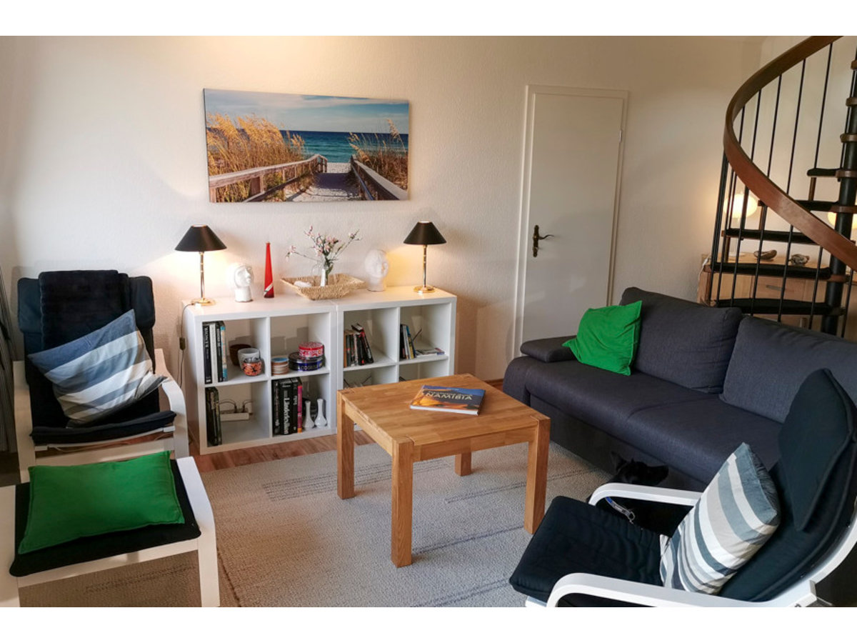 Die Wohnung ist schön geschnitten und bietet Platz für zwei bis vier Erwachsene. Sie befindet sich im Obergeschoss. Über eine Wendeltreppe gelangt man weiter nach oben in den Schlafbereich, welcher mit zwei Einzelbetten und einem Nachtisch ausgestattet ist.